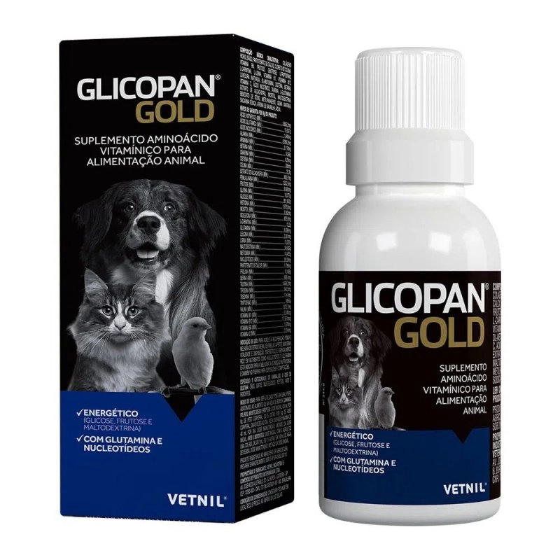 O Glicopan Gold auxilia na recuperação física e melhora o estado geral do pet. Estimula o apetite, mantém a vitalidade e disposição. Energético e especialmente rico em nutrientes como nucleotídeos e glutamina, está indicado para a melhora da condição nutricional e também no preparo para exposições e competições.