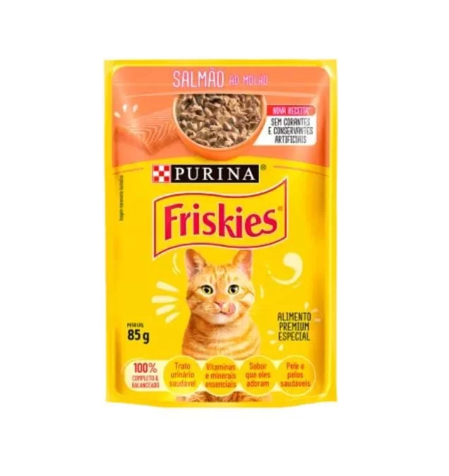 A Ração Nestlé Purina Friskies Sachê Salmão ao Molho para Gatos é um alimento úmido completo e balanceado destinado a gatos adultos. Produto pronto para o consumo.Conservar o produto em local seco e fresco. Depois de aberto, manter sob refrigeração e consumir em até 48h. Não congelar.