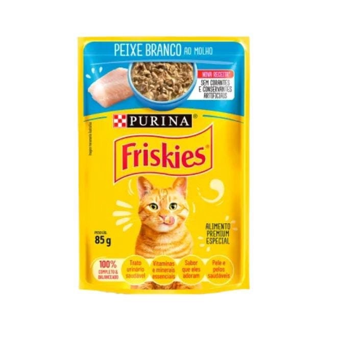 A Ração Úmida Nestlé Purina Friskies Peixe Branco ao Molho para Gatos Adultos é um alimento úmido completo e balanceado destinado a gatos Adultos.