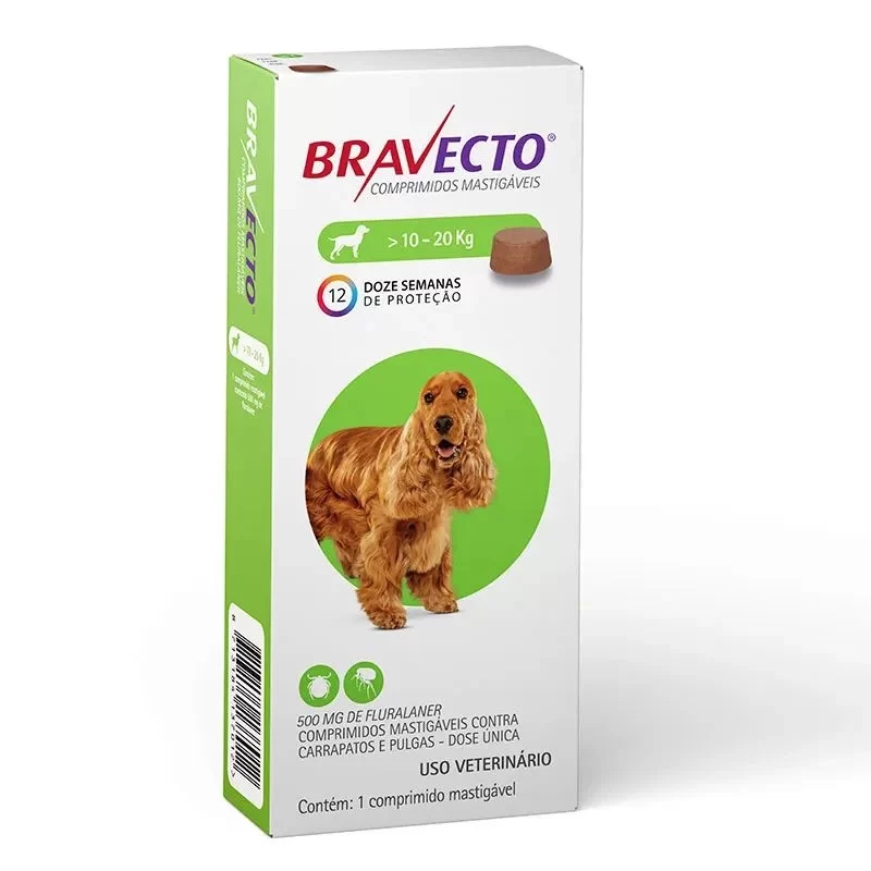 O Antipulgas e Carrapatos MSD Bravecto para Cães de 10 a 20 Kg é um primeiro comprimido mastigável, indicado para o tratamento de infestações por carrapatos e pulgas, em cachorros, proporcionando 12 semanas de proteção. É um inseticida e acaricida, sistêmico com longa duração de ação, que promove eficácia imediata e persistente por 12 semanas contra carrapatos (formas adultas e jovens de ixodes ricinus, ixodes hexagonus, ixodes holocyclus, Ixodes scapularis dermacentor reticulatus, dermacentor variabilis e rhipicephalus sanguineus) e pulgas (ctenocephalides felis e ctenocephalides canis). Pulgas e carrapatos devem estar aderidos ao cachorro, e já tendo iniciada a alimentação para serem expostos ao princípio ativo. O início da ação é rápida dentro de 8 horas para pulgas e 12 horas para carrapatos. O produto pode ser utilizado como parte de uma estratégia de tratamento para a dermatite alérgica à picada de pulgas.
